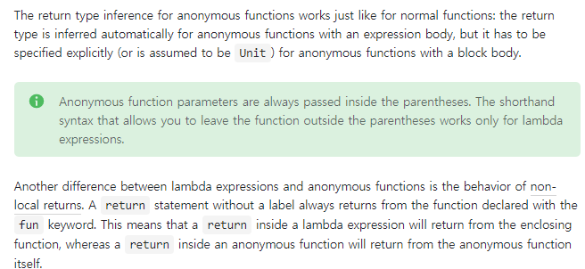 반면에 익명함수도 fun키워드를 사용하기 때문에 내부에서 return을 사용하면 최근접 둘러싼 fun이 자기 자신이기 때문에 자기 자신을 리턴하게 된다.