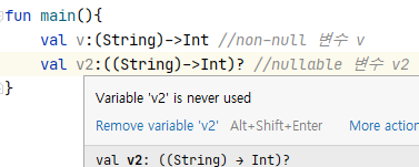 - nullable한 function type을 지정하기 위해서는 바깥에 ()를 한번더 감싼후 ?를 지정한다.