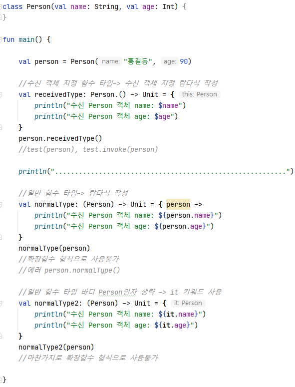 class Person(val name: String, val age: Int) { }Person 객체 수신 함수타입