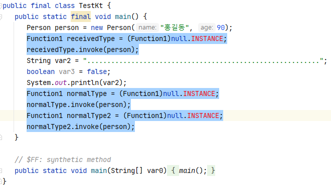 수신 객체 함수 타입은 확장함수 형식으로 사용해도 실제로 일반 형식으로 호출되는 것을 볼 수 있다.