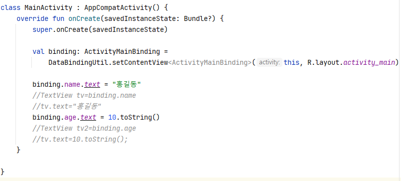 데이터 바인딩 클래스의 인스턴스가 binding에 대입되고 binding변수를 통해 뷰를 가져올수 있으며