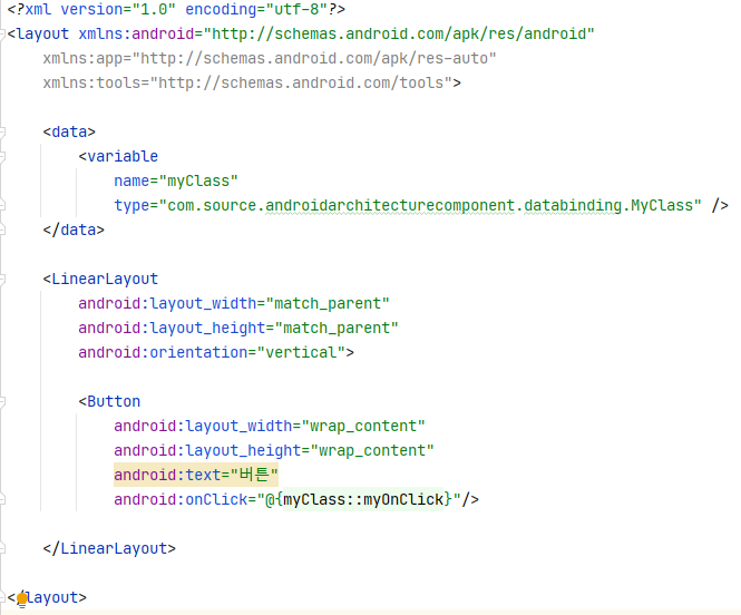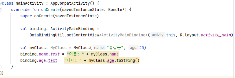 데이터 바인딩 클래스의 MyClass타입 변수 myClass의 property들을 각각의 TextView의 text속성에 바인딩 하였다.