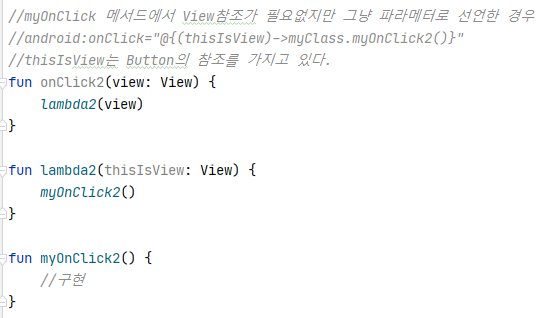 myOnClick2에서 View의 참조를 사용해야 할 경우 View를 파라메터로 설정하고 람다식 바디에서도 view를 받아야 한다.