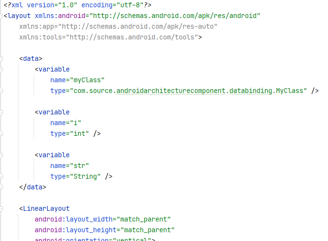 이전까지의 단계에 그치면 ViewBinding의 기능밖에 해당되지 않는다. ui값 변경에 필요한 변수를 layout에서 선언하자.