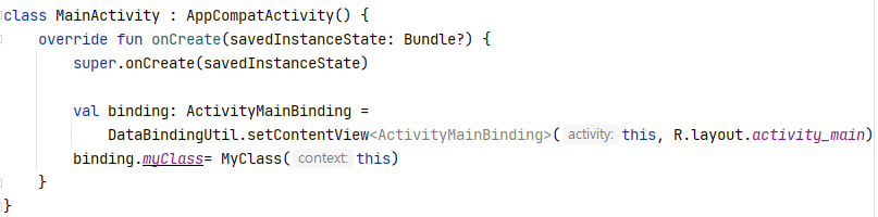 본 테스트에서는 MainActivity.kt에서 항상 binding인스턴스의 myClass변수에 MyClass인스턴스를 넣어줘야한다.