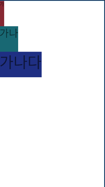 <?xml version="1.0" encoding="utf-8"?> <LinearLayout xmlns:android="http://schemas.android.com/apk/res/android" xmlns:app="http://schemas.android.com/apk/res-auto" android:id="@+id/root" android:layout_width="match_parent" android:layout_height="match_parent" android:orientation="vertical"> <TextView android:id="@+id/textView" android:layout_width="wrap_content" android:layout_height="100dp" android:background="#882833" android:text="가" android:textSize="20sp" /> <TextView android:id="@+id/textView2" android:layout_width="wrap_content" android:layout_height="100dp" android:background="#186873" android:text="가나" android:textSize="40sp" /> <TextView android:id="@+id/textView3" android:layout_width="wrap_content" android:layout_height="100dp" android:background="#1F2F83" android:text="가나다" android:textSize="60sp" /> </LinearLayout>