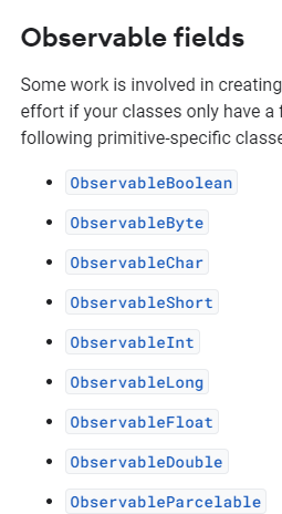 이렇게 ViewModel에서 값을 변경해도 ui가 변경되지 않기 때문에 DataBinding은 Observable한 필드와 객체들을 지원한다.