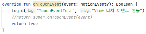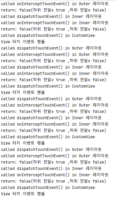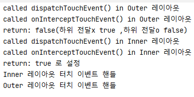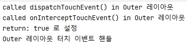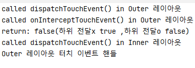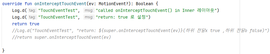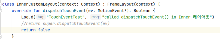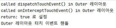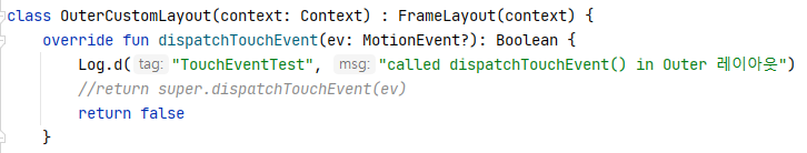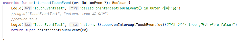 override fun onInterceptTouchEvent(ev: MotionEvent?): Boolean { Log.d("TouchEventTest", "called onInterceptTouchEvent() in Outer 레이아웃") Log.d("TouchEventTest", "return: true 로 설정") return true //Log.d("TouchEventTest", "return: ${super.onInterceptTouchEvent(ev)}(하위 전달x true ,하위 전달o false)") //return super.onInterceptTouchEvent(ev) }Outer레이아웃 터치