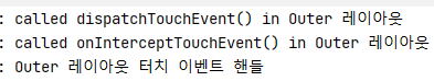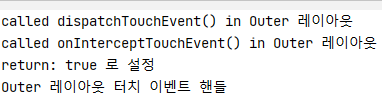 dispatchTouchEvent의 동작을 보고 싶었는데 Outer레이아웃값을 false로 설정하고 Outer,Inner레이아웃, View모두 터치한 결과 Outer의 onInterceptTouchEvent메서드가 호출되지 않는다.
