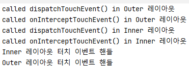 더 궁금해져서 Outer레이아웃의 dispatchTouchEvent를 원상복귀시키고 Inner레이아웃의 dispatchTouchEvent의 return값을 false로 한후 Inner레이아웃을 터치하니