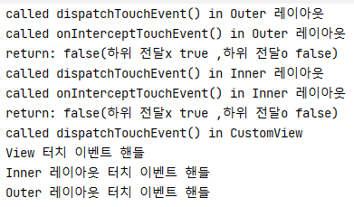 CustomView의 onTouchEvent가 true이지만 Inner레이아웃의 가로챔이 true라서 CustomView에 터치 이벤트가 전달되지 않아 onTouchEvent또한 호출될 기회가 없어지기 때문에 Inner레이아웃, Outer레이아웃 순서대로 터치 이벤트가 처리된다.