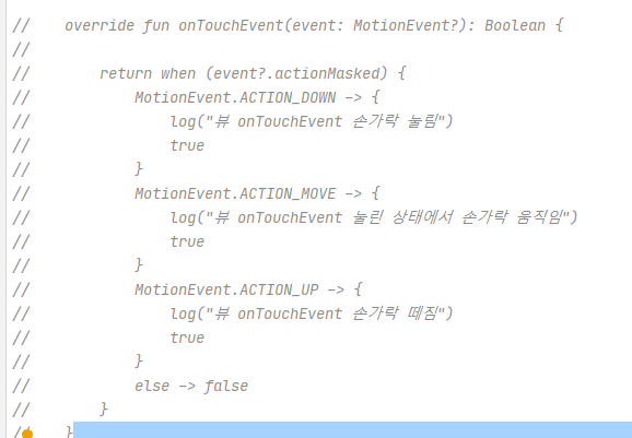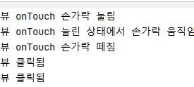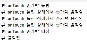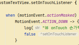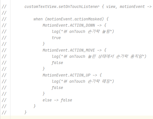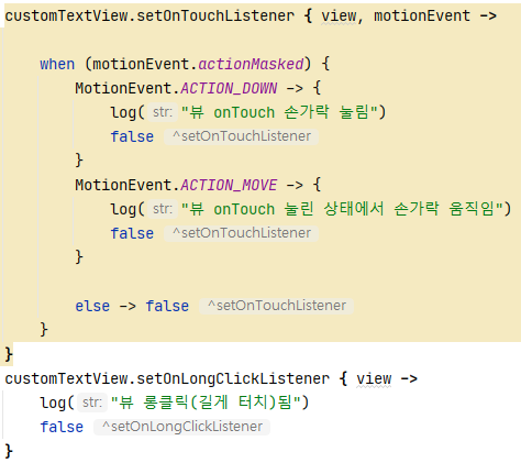 customTextView.setOnTouchListener { view, motionEvent -> when (motionEvent.actionMasked) { MotionEvent.ACTION_DOWN -> { log("뷰 onTouch 손가락 눌림") true } MotionEvent.ACTION_MOVE -> { log("뷰 onTouch 눌린 상태에서 손가락 움직임") false } MotionEvent.ACTION_UP -> { log("뷰 onTouch 손가락 떼짐") false } else -> false } }
