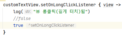 //onCreate에 클릭 리스너 설정 customTextView.setOnClickListener { view -> log("뷰 클릭됨") }setOnTouchListener를 주석 처리하고 onTouchEvent에서 다뤄보자. (onTouch에서 하려면 더 주의해야할 것이 있어서)
