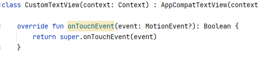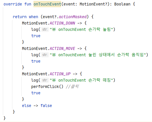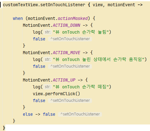 customTextView.setOnTouchListener { view, motionEvent -> when (motionEvent.actionMasked) { MotionEvent.ACTION_DOWN -> { log("뷰 onTouch 손가락 눌림") true } MotionEvent.ACTION_MOVE -> { log("뷰 onTouch 눌린 상태에서 손가락 움직임") false } MotionEvent.ACTION_UP -> { log("뷰 onTouch 손가락 떼짐") view.performClick() true } else -> false } }