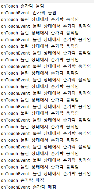 터치 이벤트를 계속 받기 때문에 받을 때마다 onTouch메서드도 꾸준히 호출되어 로그가 계속 찍히게 된다.