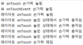 val root: View = findViewById(R.id.container) //상위 ViewGroup에 true를 준 경우 root.setOnTouchListener { v, event -> when (event?.actionMasked) { MotionEvent.ACTION_DOWN -> log("레이아웃 onTouch 손가락 눌림") MotionEvent.ACTION_MOVE -> log("레이아웃 onTouch 눌린 상태에서 손가락 움직임") MotionEvent.ACTION_UP -> log("레이아웃 onTouch 손가락 떼짐") } true } root as ViewGroup