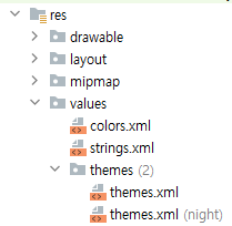 안드로이드 스튜디오가 업데이트 되면서 styles.xml 대신 themes.xml로 파일이름이 변경되었다고 한다.