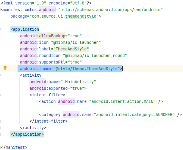 프로젝트를 생성하고 기본으로 매니패스트에 <application>에 설정된 테마 Theme.ThemeAndStyle