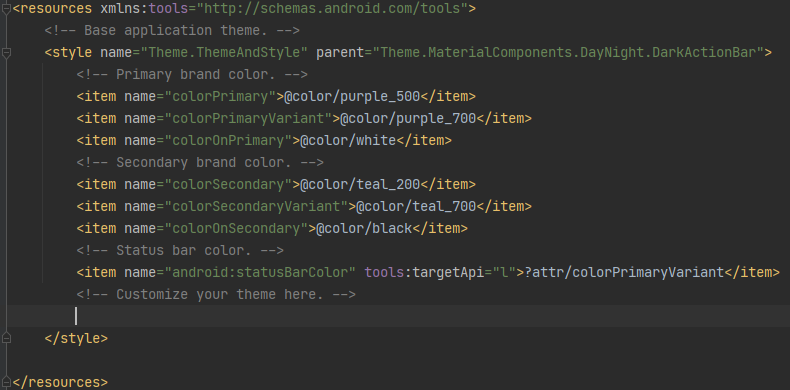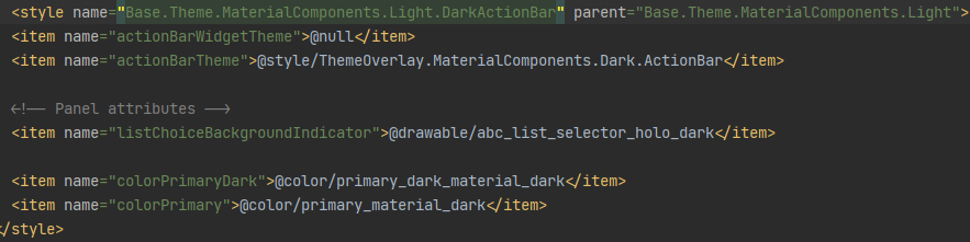 colorPrimary, colorSecondary등등은 테마 속성이다. 프로젝트가 만들어지면서 조상의 것을 사용하지 않고 새로 재정의되어있는데 조상 스타일들을 따라가 보면( parent="조상 테마" <- 조상 테마 컨트롤 +클릭 )