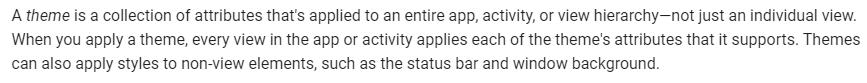 테마는 앱 전체 , 액티비티, 뷰 계층에 적용되는 속성들의 모음이다- 하나의 뷰에서만 적용되는 것이 아니다.