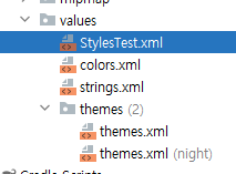 StylesTest.xml로 이름을 임의로 정했다. 현재는 values바로 하위에 만들었는데 테마와 스타일 관련이니 themes 폴더 안에 만들어주는게 좋을 듯 하다.