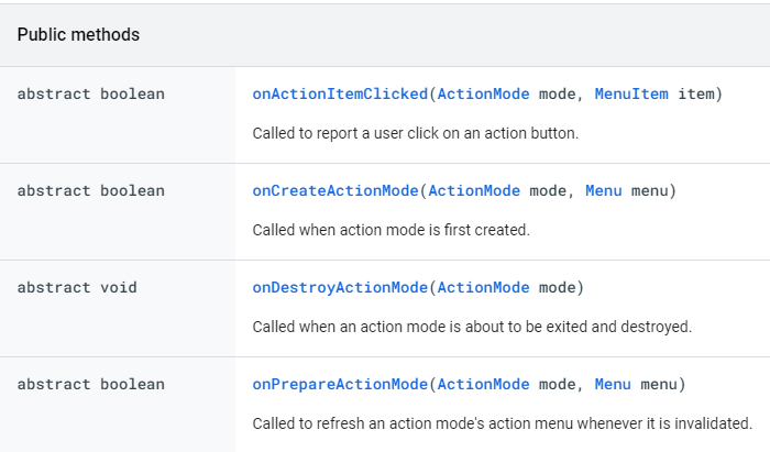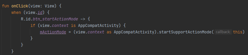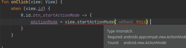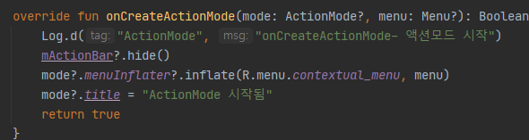 open fun startActionMode(callback: ActionMode.Callback!, type: Int): ActionMode!type 액션모드 타입선택