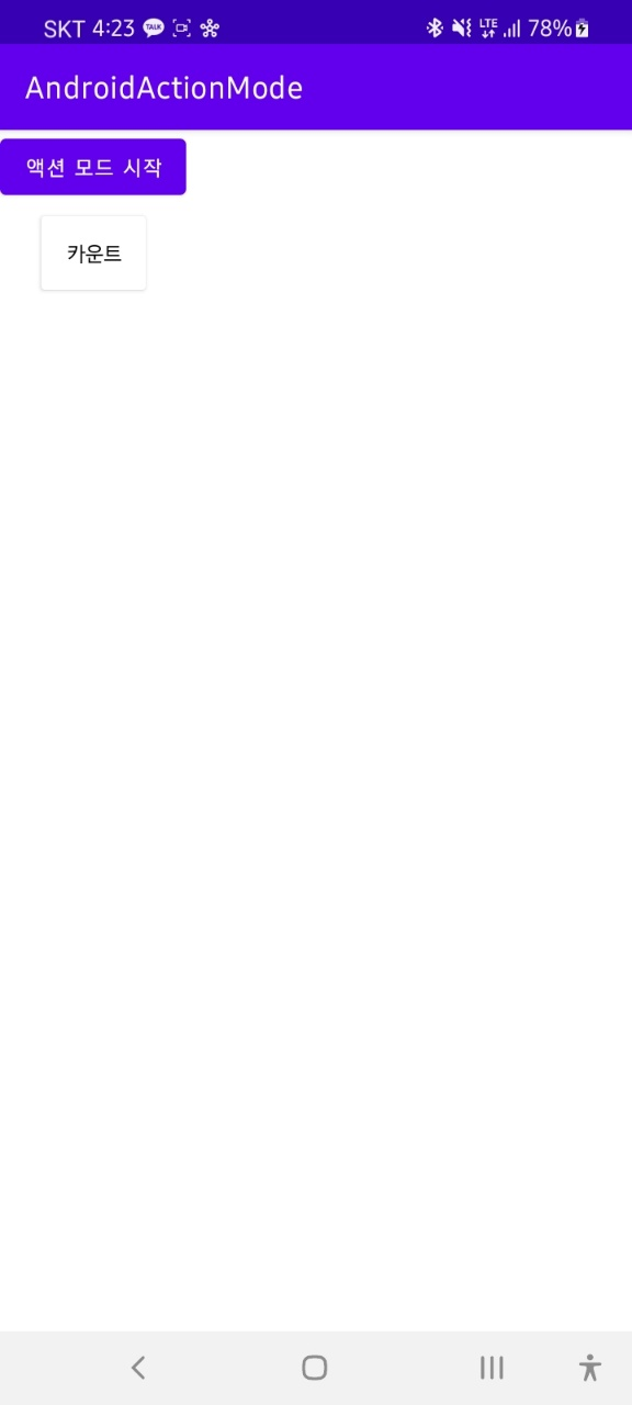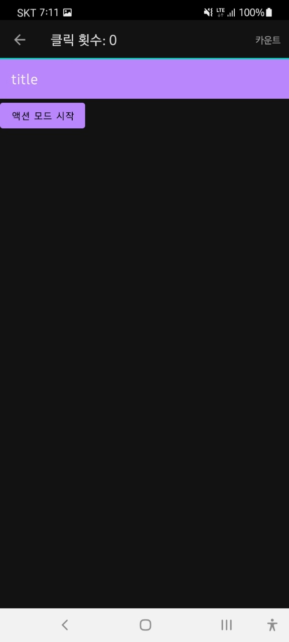 <?xml version="1.0" encoding="utf-8"?> <menu xmlns:android="http://schemas.android.com/apk/res/android" xmlns:app="http://schemas.android.com/apk/res-auto"> <item android:id="@+id/item_count" android:title="카운트" app:showAsAction="ifRoom"/> </menu>- 카운팅에 맞게 ActionMode.Callback인터페이스 구현