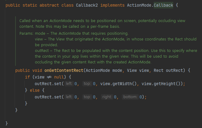 윈도우의 decor뷰가 ActionMode를 시작시켜서 onGetContentRect의 view파라메터로 decor뷰가 넘어온다.