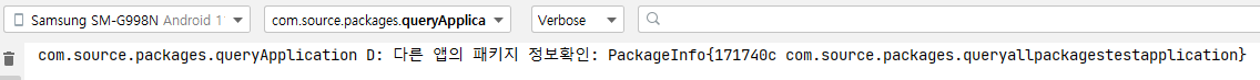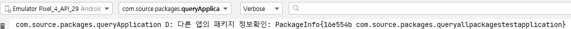 class MainActivity : AppCompatActivity() { override fun onCreate(savedInstanceState: Bundle?) { super.onCreate(savedInstanceState) setContentView(R.layout.activity_main) val packageManager = packageManager try { //디바이스에 설치된 다른 앱 - com.source.packages.queryallpackagestestapplication //다른 앱의 패키지 정보를 확인 val packageInfo = packageManager .getPackageInfo("com.source.packages.queryallpackagestestapplication", 0) log("다른 앱의 패키지 정보확인: $packageInfo") //안드로이드 10이하 //확인하고 싶은 앱이 디바이스에 설치되어있고 //정보를 가져오려하면 예외 발생하지 않음 } catch (e: Exception) { //안드로이드 11 //확인하고 싶은 앱이 깔려있고 //정보를 가져오려하면 package visibility 로 인해 예외 발생 log("패키지를 가져올 수 없습니다") if (e is PackageManager.NameNotFoundException) { log("PackageManager.NameNotFoundException") } } } private fun log(str: String) { Log.d("GET_PACKAGE_INFO_TEST", str) } }API 29 (Android10)