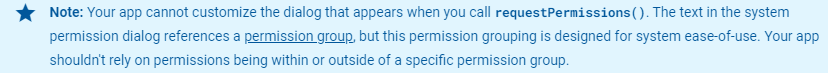 permission group에 해당하는 텍스트를 띄워주는 시스템 다이얼로그로, requestPermissions를 호출하였을시에는 다이얼로그를 커스터마이징 할 수 없다.