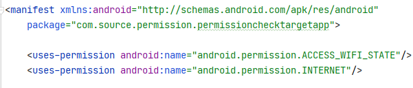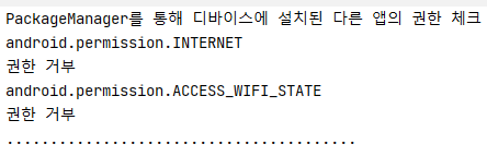class CheckAnotherAppPermission : AppCompatActivity() { private var mPermissions //B앱에서 사용하는 권한 = mutableListOf<String>(Manifest.permission.INTERNET, Manifest.permission.ACCESS_WIFI_STATE) override fun onCreate(savedInstanceState: Bundle?) { super.onCreate(savedInstanceState) setContentView(R.layout.activity_check_another_app_permission) log("PackageManager를 통해 디바이스에 설치된 다른 앱의 권한 체크") val pm = packageManager for (item in mPermissions) { log(item) var check: Int = pm.checkPermission( item, "com.source.permission.permissionchecktargetapp" //B앱의 패키지명 ) if (check == PackageManager.PERMISSION_GRANTED) { log("권한 승인") } else { log("권한 거부") } } log("........................................") } private fun log(str: String) { Log.d("PERMISSION_TEST", str) } }