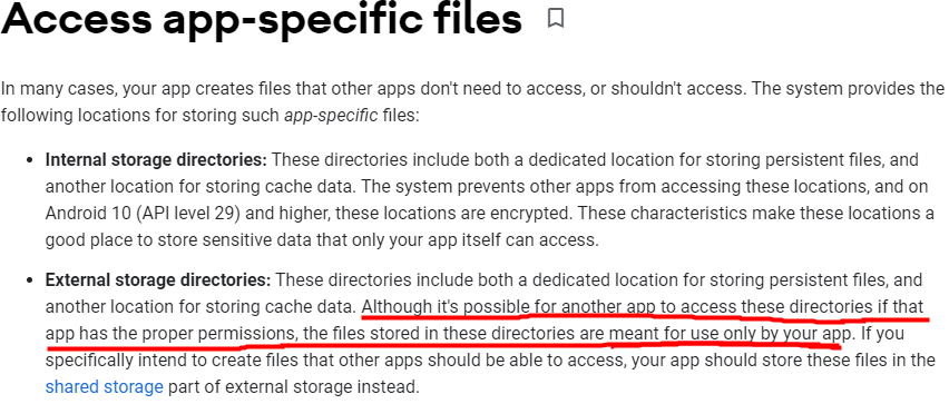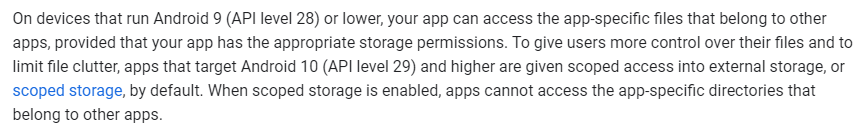 Legacy Storage에서는 적절한 권한만 있으면 다른 앱의 외부저장소 앱 개별공간의 파일에 접근할 수 있다. 이렇게 다른 앱에서 권한만 있으면 접근이 가능하지만 이 공간의 실제적 의미는 앱 개별으로만 사용할 파일을 저장하는 곳이다.