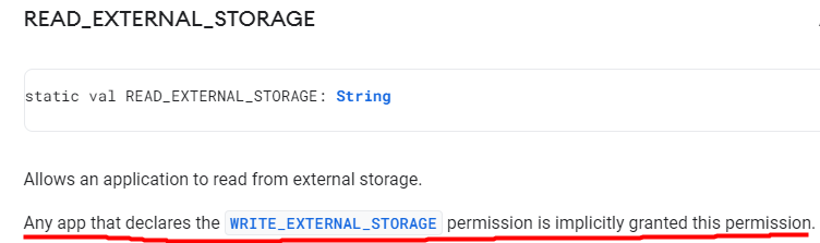 WRITE권한을 얻으면 READ도 자동으로 얻는다고 되있는데 Scoped Storage에는 변경사항이 있어서 정확히 어떻게 동작하는지 모르겠다.