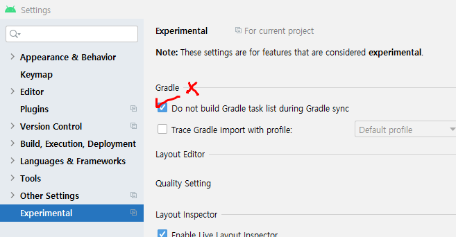 Gradle view를 클릭하여 열었을 때 Tasks가 없으면 셋팅에서 Tasks 를 숨김해제로 변경
