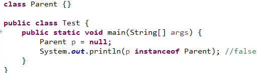 변수가 Parent, Child인스턴스가 아님에도 변수에 null이 담겨있어 true로 리턴됨을 확인했다.